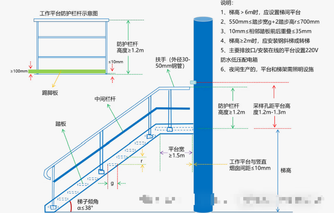 1、工作平台长度应≥2m,宽度应保证人员及采样探杆操作的空间。对于监测断面直径(圆形)或者在监测孔方向的长度(矩形)>1m的,工作平台宽度应≥2m;≤1m的,工作平台宽度应≥1.5m。